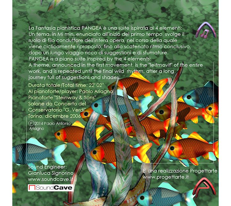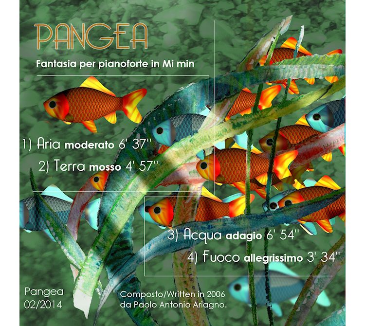 La Fantasia pianistica PANGEA è una suite ispirata ai 4 elementi: Un tema, in Mi min, enunciato all’inizio del primo tempo, svolge il ruolo di filo conduttore dell’intera opera, nel corso della quale viene ciclicamente riproposto, fino allo scatenato ritmo conclusivo, dopo un lungo viaggio ricco di suggestioni e di sfumature.