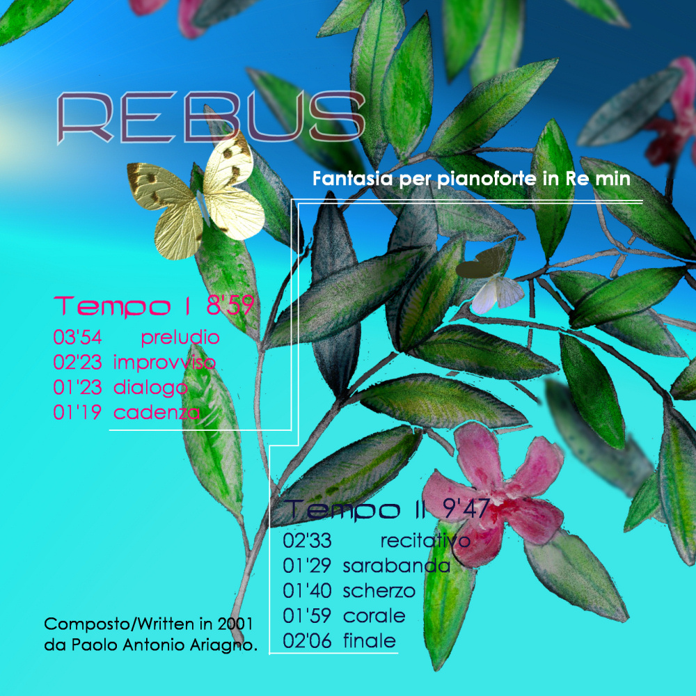 A theme that rises, lives and expires within two wide movements, a long music journey, this is Rebus, piano fantasy in Suite concept, in which the love for the great compositional forms of the past joins the search for new sounds appealing, to offer a pleasant and never banal listening..