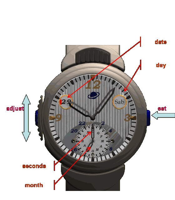 Saturno, concepito come un orologio con meccanica elettronica al quarzo, rende possibili molteplici funzioni: clicca sulla voce corrispondente, per vedere come cambia l'indicazione del quadrante: