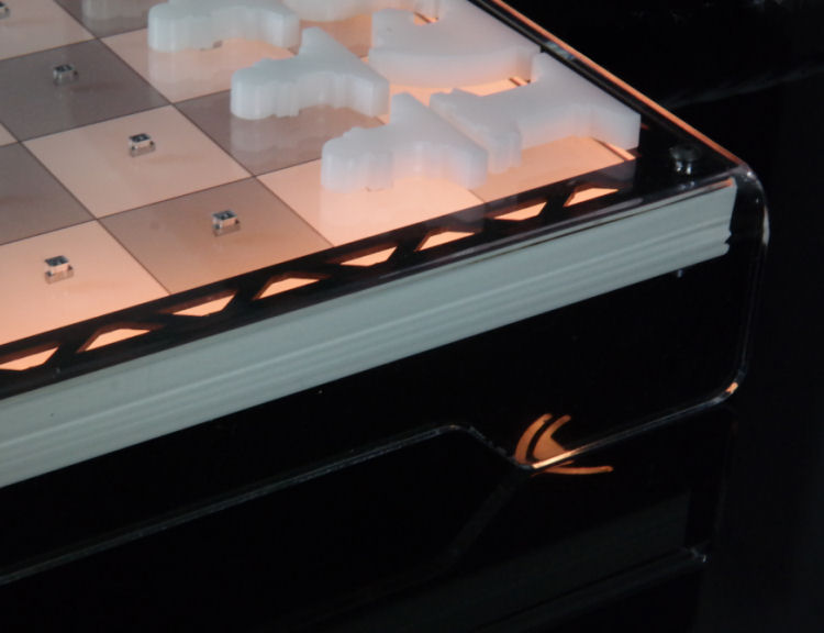Il piano di appoggio è costituito da una doppia lastra di plexiglass fotoincisa inferiormente (per evitare righe o graffi), la doppia scatola inferiore, in lamiera verniciata, ospita sia il gruppo di illuminazione a LED che la centralina di controllo, il tutto gestito da un pratico telecomando, in modo da creare tantissimi effetti luminosi.